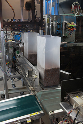 Automatically transfer the growing medium agitated in the mixer to the bagging machine. Automatic transfer can be achieved by linking the mixer and the bagging machine.