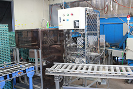 Sterilisation carts set up with a Transport of containers will automatically remove the containers and move them to the conveyor.
