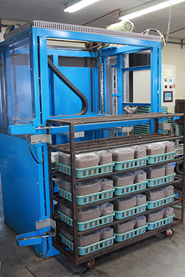 Fold the bagged growing mediums, arrange them into sterilisation containers, and automatically transfer them to the sterilisation carts.