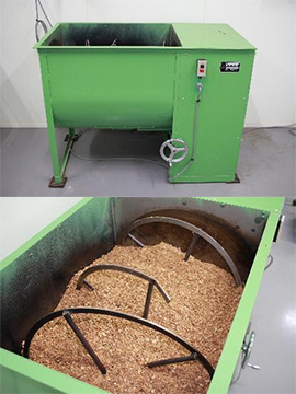 The first step is to add water and nutrients such as bran to the raw materials, namely fine sawdust and coarse chips of hardwood, and agitate the growing medium until it is evenly mixed. We have a variety of products that are large enough for us to mix the growing medium for about 50 to 150 units of 2.5 kg mushroom beds at the same time. The moisture content is adjusted to about 60%.