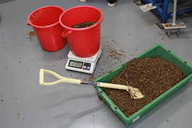 The agitated growing medium from the mixer is moved to the bagging machine using a container.