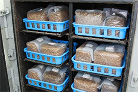 The bagged growing medium is set up in a sterilisation container and set in the steriliser. After the lid is closed, the steriliser sterilises the growing medium with steam to make it sterile. The sterilisation process takes about 9 hours.