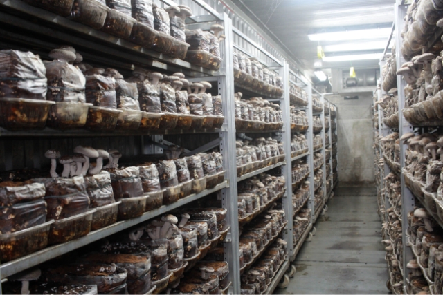 18 shelves can be accommodated inside a container, and when harvesting mushrooms, the shelves are slid sideways and harvested in sequence.