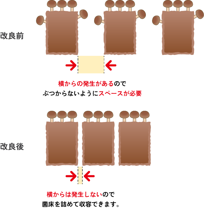集中発生を平準化する事で、労力が分散・均一化できます。A品率が上がり、きのこが大きくなるので、従来より収穫・パック作業が軽減されます。